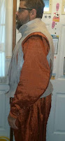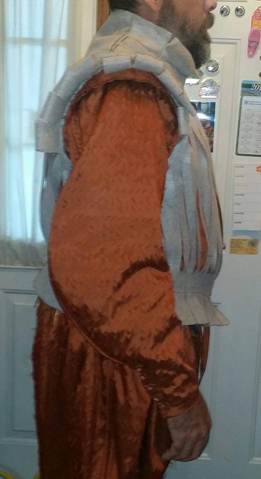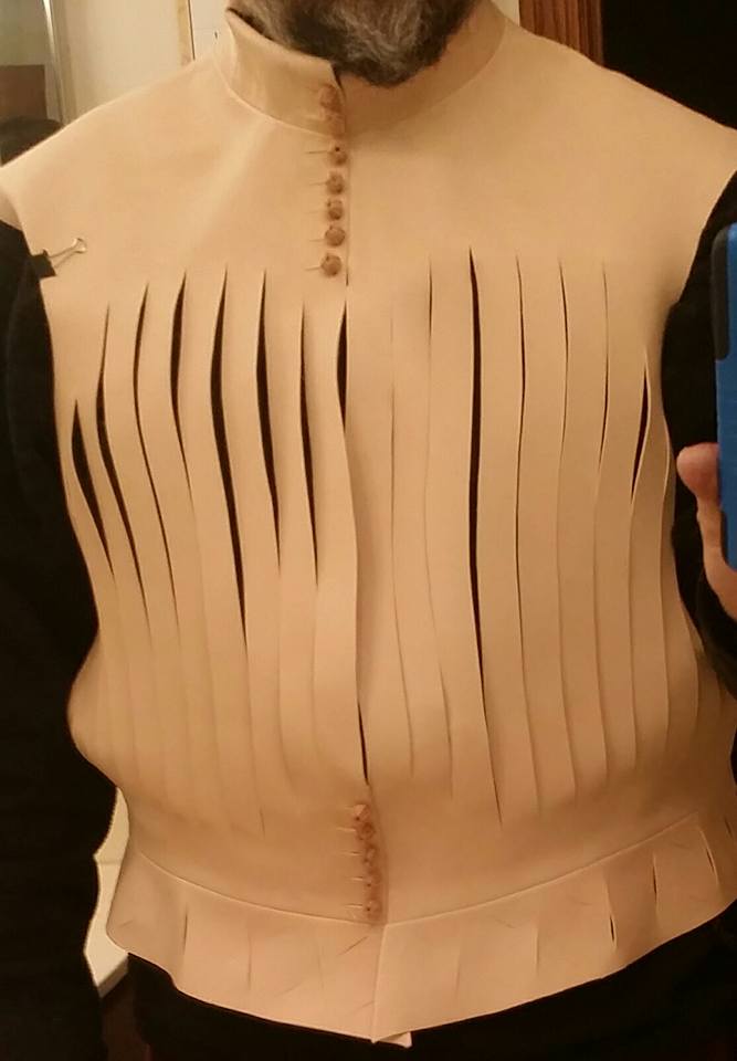 I wasn't sure how I would wear the jerkin. Some images show a gentleman wearing it buttons undone while other show the buttons fastened to the neck. Either way I like the way it looks and fits. The collar had to be loose enough to fit a rough and thick collar underneath. Fits well.