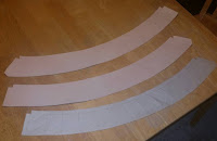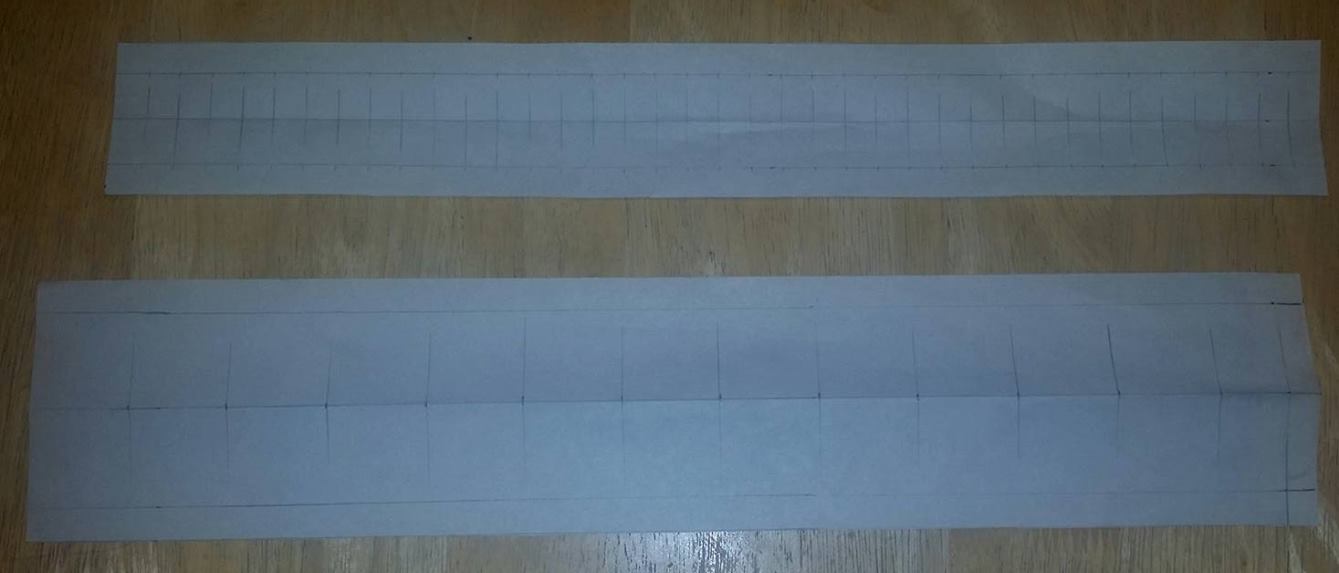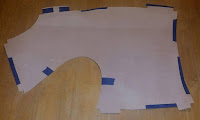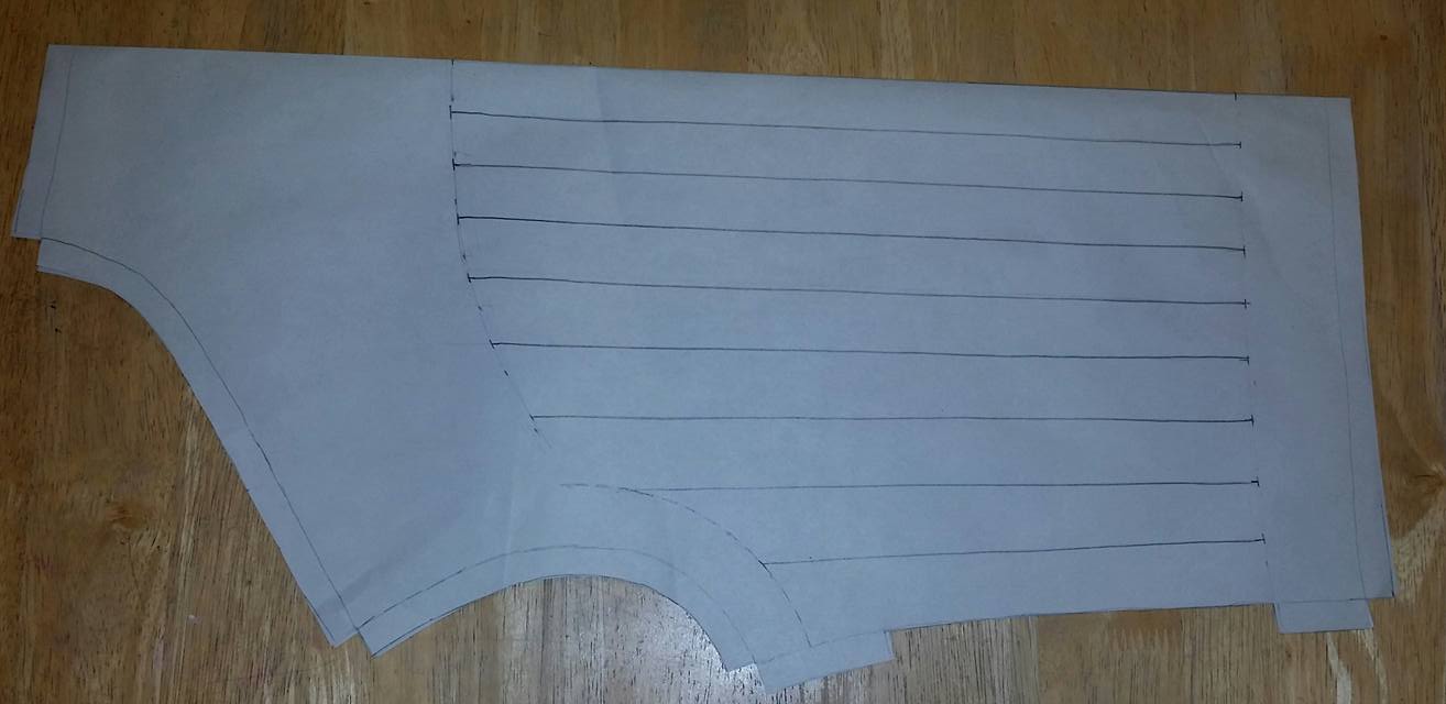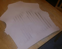 I cut the prototype apart along the stitching. I then transcribed the pattern, making some small modifications, to paper. I added seam allowances and space for some rolled edges. I measured out the lines for the slashing and pattern was set.