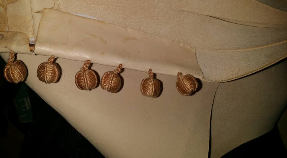 To attach the buttons I threaded the button through a hole along a line which would be the outside edge of the jerkin. I place a leather lace on the inside and tied the button to the lace. This way as tension was put on the button it would be less likely to tear out from the jerkin. All the pressure will be along the lacing which will distribute stress to the inside of the jerkin.
