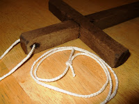 As part of a role that I intend to play at an event I will be playing the part of a Monk. This wooden cross was cut from a square dowel purchased from Home Depot. I cut a lap joint in two pieces and hand finished the joint with carving knives. I glued the cross and then stained it with some of my homemade black walnut stain. The cross is strung on a line of finger loop braded cotton string.