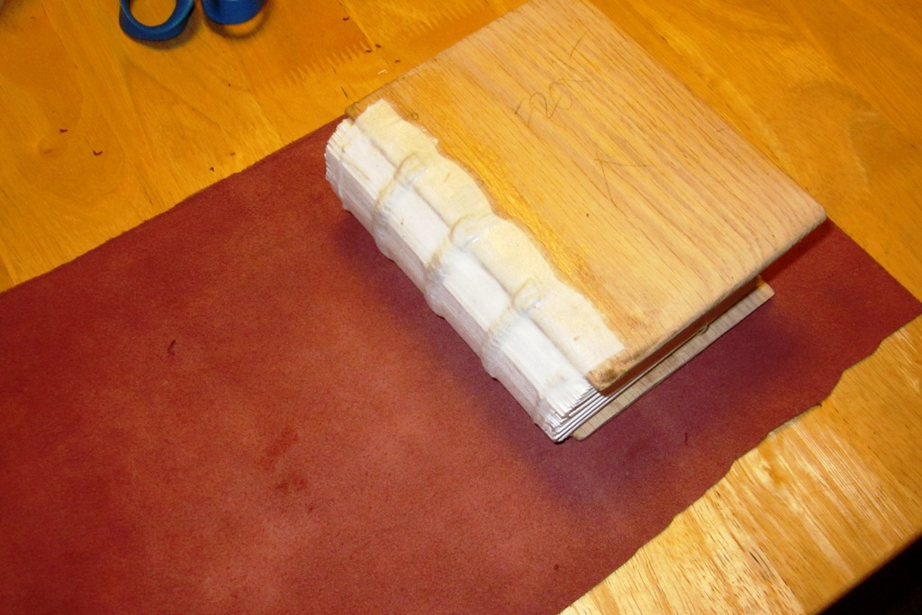I sketched the size of the book on the leather and then filled that area in with an even coat of the PVA glue. I also put a small amount of glue on the spine of the book to make sure that the cordage was fully covered along the spine.