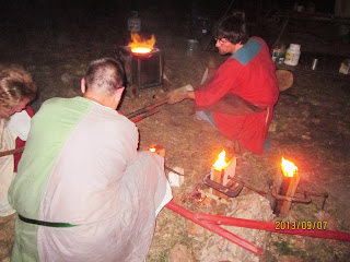 As evening progressed the bronze was melted in a propane forge. Here you can see the instructor checking on the warming metal. It was heating for about an hour or so before it was ready to pour.