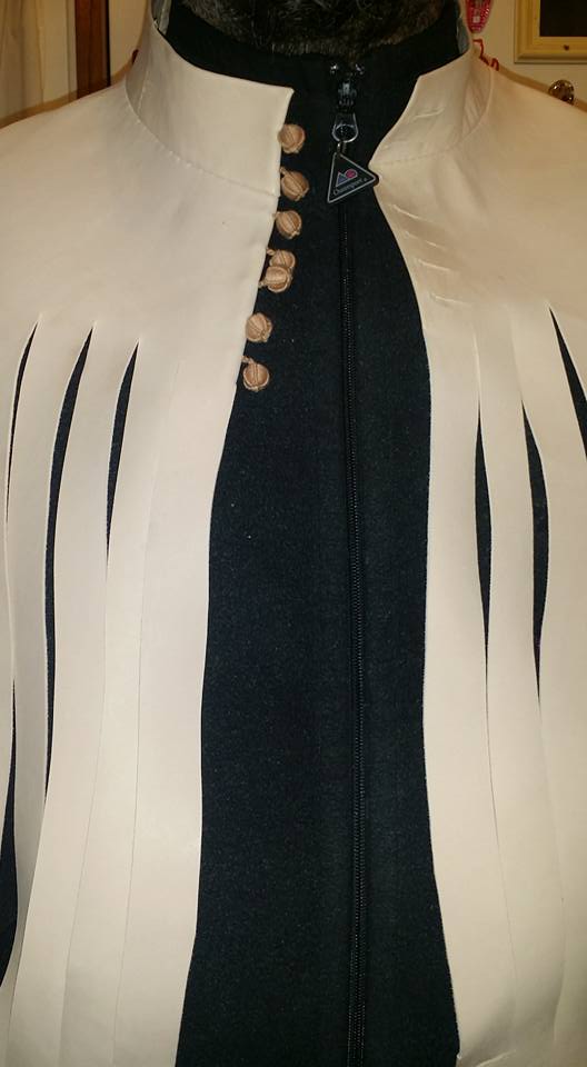 I wasn't sure how I would wear the jerkin. Some images show a gentleman wearing it buttons undone while other show the buttons fastened to the neck. Either way I like the way it looks and fits. The collar had to be loose enough to fit a rough and thick collar underneath. Fits well.